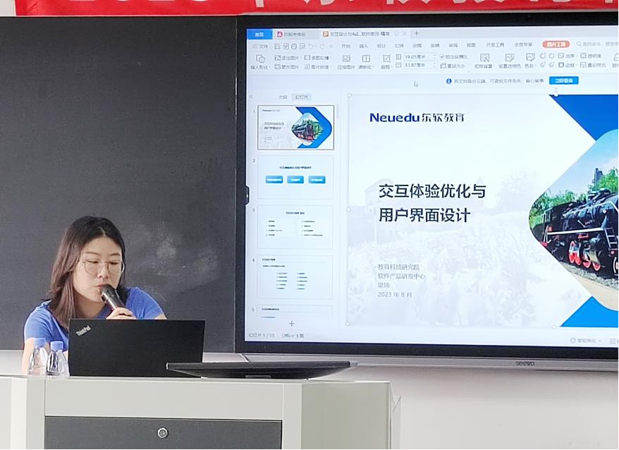 随后,球盟会(中国)教育科技集团教育科技研究院软件产品研发中心设计师梁扬进行交互体验课程讲解。内容围绕交互应用场景案例优化、UI配色技巧以及交互界面布局展开。