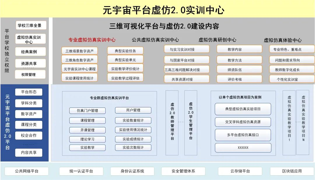 元宇宙一体化院校虚仿2.0建设解决方案采用“1+4+N”模式。“1”是指建设 1 个虚拟仿真基地(中心);“4”是指统一接口标准、统一身份认证、统一数据中心、元宇宙平台统一认证。“N”是指以二级学院专业群为单位,建设个性化的虚拟仿真实验/实训空间,并配套相应的教学资源。