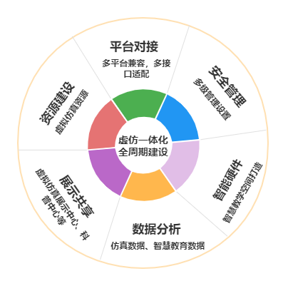 打造高匹配度的虚拟仿真实训设施设备、实训教学模式及虚拟仿真实训资源。在高效模块化硬件资源配置方面,结合用户需求将硬件资源划分为独立模块,可以根据实际需求进行组合和扩展,以满足不同规模和需求。最终给予灵活、可扩展、高性能的虚拟仿真教育环境。顺利获得合理的资源配置和优化的系统架构,来不断适应教学的需求最终满足高质量教学的要求。同时在硬件方面采用合理的资源规划和采购策略,帮助院校实现成本的节约和效益的最大化。