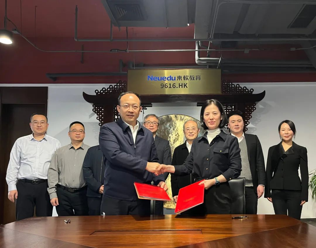座谈结束后,温涛总裁和李涛书记代表双方签署校企合作框架协议。邓海波副总裁和李建光副校长代表双方签署数智融合与健康科技产业学院合作协议。