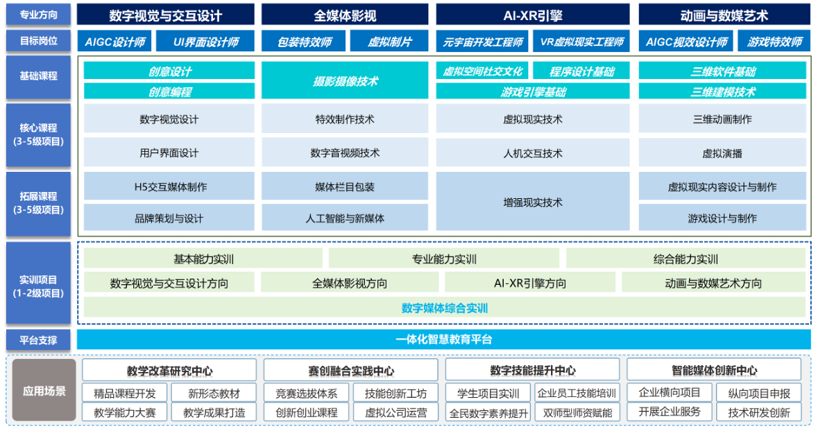 实训室聚焦AIGC设计师、UE交互设计师、包装特效师、AIGC视频制作师、元宇宙开发工程师、虚拟制片、Unity/UE开发工程师等岗位的“数字工匠”人才培养。面向中国大学生计算机设计大赛、全国大学生广告艺术大赛、蓝桥杯全国软件和信息技术专业人才大赛、中国好创意暨全国数字艺术设计大赛、未来设计师·全国高校数字艺术设计大赛、中国虚拟现实大赛、全国大学生数字媒体科技作品及创意竞赛等赛项,搭建覆盖数字媒体大类人才培养全过程的进阶式一体化实践教学体系,并建设与之配套的软硬件实训设备与环境、智慧化管理平台以及相关实训教学文档和资源。