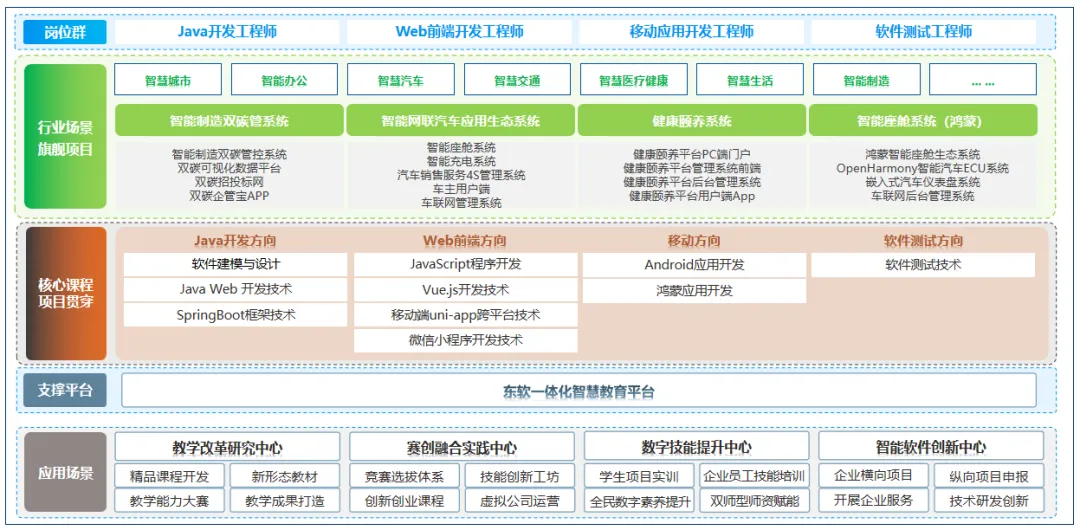可以支撑Android工程师、Web前端工程师、鸿蒙应用开发工程师、Java开发工程师、软件测试工程师多岗位能力培养。