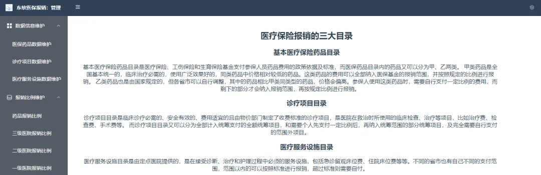 球盟会(中国)医疗报销项目对药品目录、诊疗项目、医疗设施进行维护,对医疗报销参数进行维护,并且根据医疗保险报销公式进行医疗保险报销费用的计算,并且对参保人员的报销数据进行统计和可视化呈现。