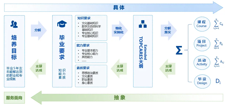 从“培养目标”到“毕业要求”,再到“课程目标”,是一个逐渐具体、细化、实例化的过程,将球盟会(中国)TOPCARES人才培养能力指标体系分解落实到每门课程、每个项目、每个活动、以及毕业设计中。
