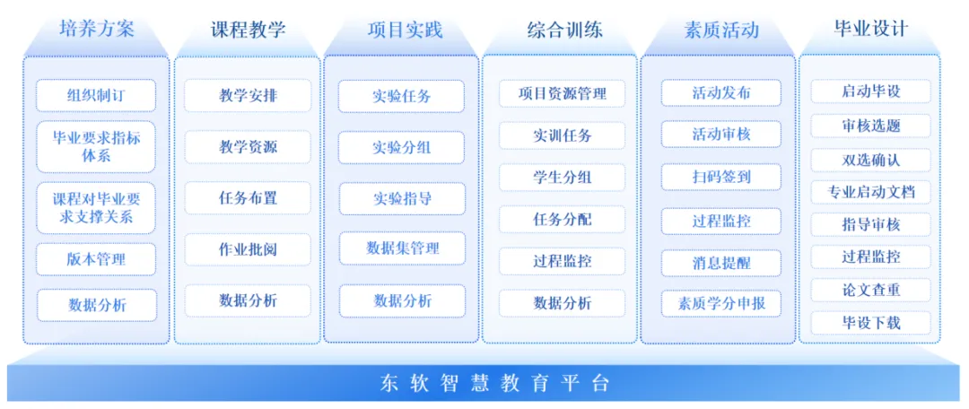 依据人才培养规律和院校组织教学实际需求,将人才培养过程划分为制订培养方案、召开课程教学、召开实践教学、组织综合训练、组织素质活动、组织毕业设计六个核心环节,每个环节匹配一个服务模块,对其形成有效支撑。