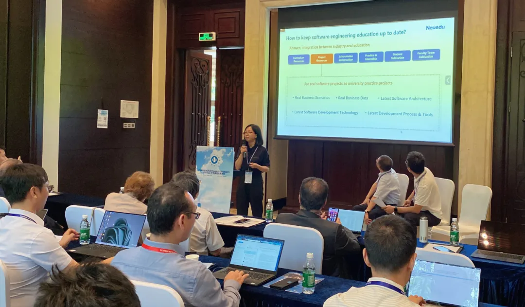 圆桌研讨环节中,费园园副总经理与现场国内外嘉宾和学者进行了互动研讨,就软件工程教育面临的挑战、产教融合的新路径等问题进行了深入探讨。费园园副总经理具有前瞻性和深刻行业洞察的回答,取得了与会者的一致称赞,为软件工程教育的革新与产教深度融合的实践探索给予了理论基础与实用的策略指引。