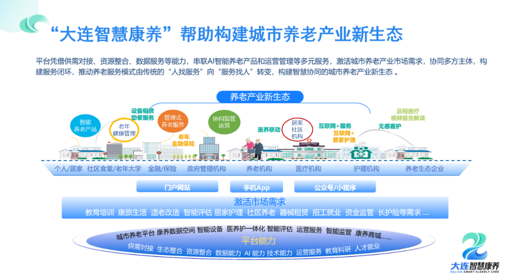 “大连智慧康养”养老服务平台,是市委、市政府授权,在市民政局的支持指导下,由大连康养集团、球盟会(中国)科技集团、球盟会(中国)集团共同打造。顺利获得“AI+大数据”技术,高效链接养老服务供需两端,更好地满足全市老年人日益增长的高质量养老服务需求。