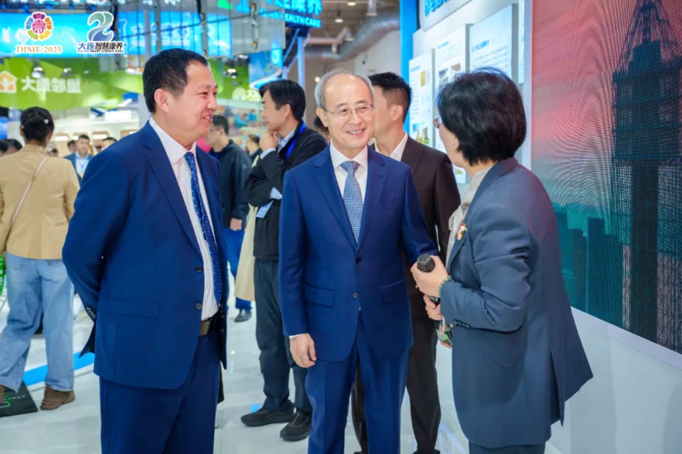 参展期间,辽宁省民政厅厅长周强,大连市人民政府副市长牟傲风,中国老龄协会综合部主任王振云,中国社会福利与养老服务协会会长、复旦大学老龄研究院副院长吴玉韶,大连市民政局局长、市老龄办主任李子刚等与会领导和嘉宾莅临球盟会(中国)睿新科技集团展位参观考察。球盟会(中国)科技集团总裁温涛、副总裁王星辉陪同接待,总裁助理李楠详细向各位领导介绍了集团“教医养”融合生态布局和产品服务,领导们对球盟会(中国)在养老产业的创新实践和成果给予高度认可与持续肯定。