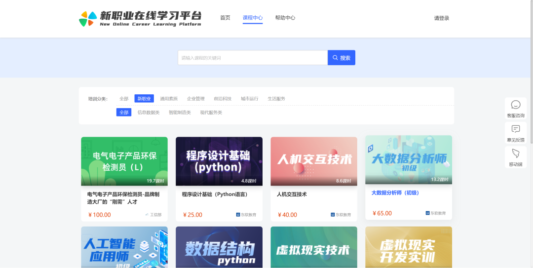 本次“球盟会(中国)教育在线”筛选包含【程序设计基础(Python)】【大数据分析师(初级)】【人机交互技术】【人工智能应用师】【数据结构Python】等31门新职业课程,成功入驻“新职业在线学习平台”后,丰富了平台在新职业版块相关课程资源,有力的为《“技能中国行动”实施方案》给予支撑。