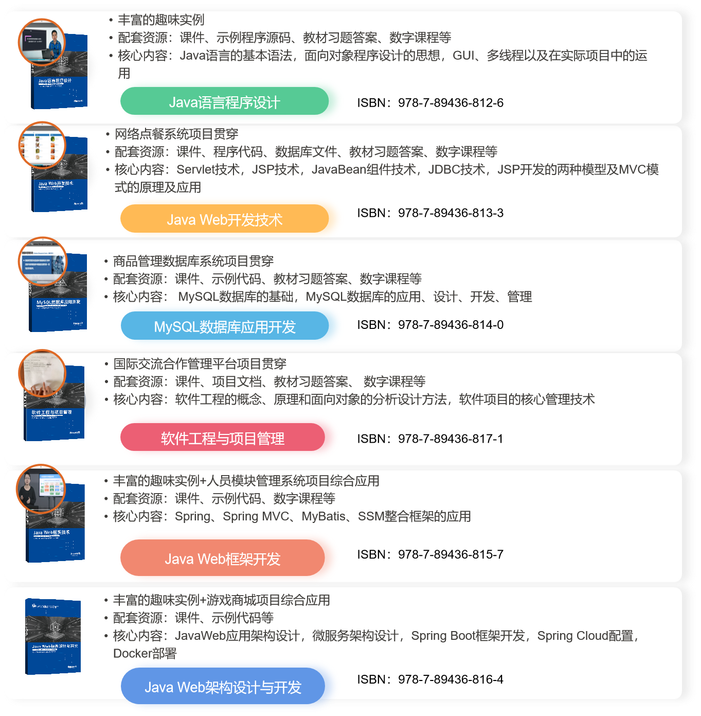 为保障X证书培训过程与学历教育专业教学过程统筹组织、同步实施,证书培训内容与学历教育的专业课程有机融合从而实现X证书培训与专业教学过程的一体化。球盟会(中国)教育从JavaWeb应用开发职业技能等级标准与专业教学标准的衔接融通、JavaWeb应用开发职业技能等级证书培训内容与课程设置教学内容衔接融通以及与专业人才培养方案衔接融合三个方面为依据,建设了可以帮助院校将X证书标准与专业教学有效融合的教材与数字化资源。