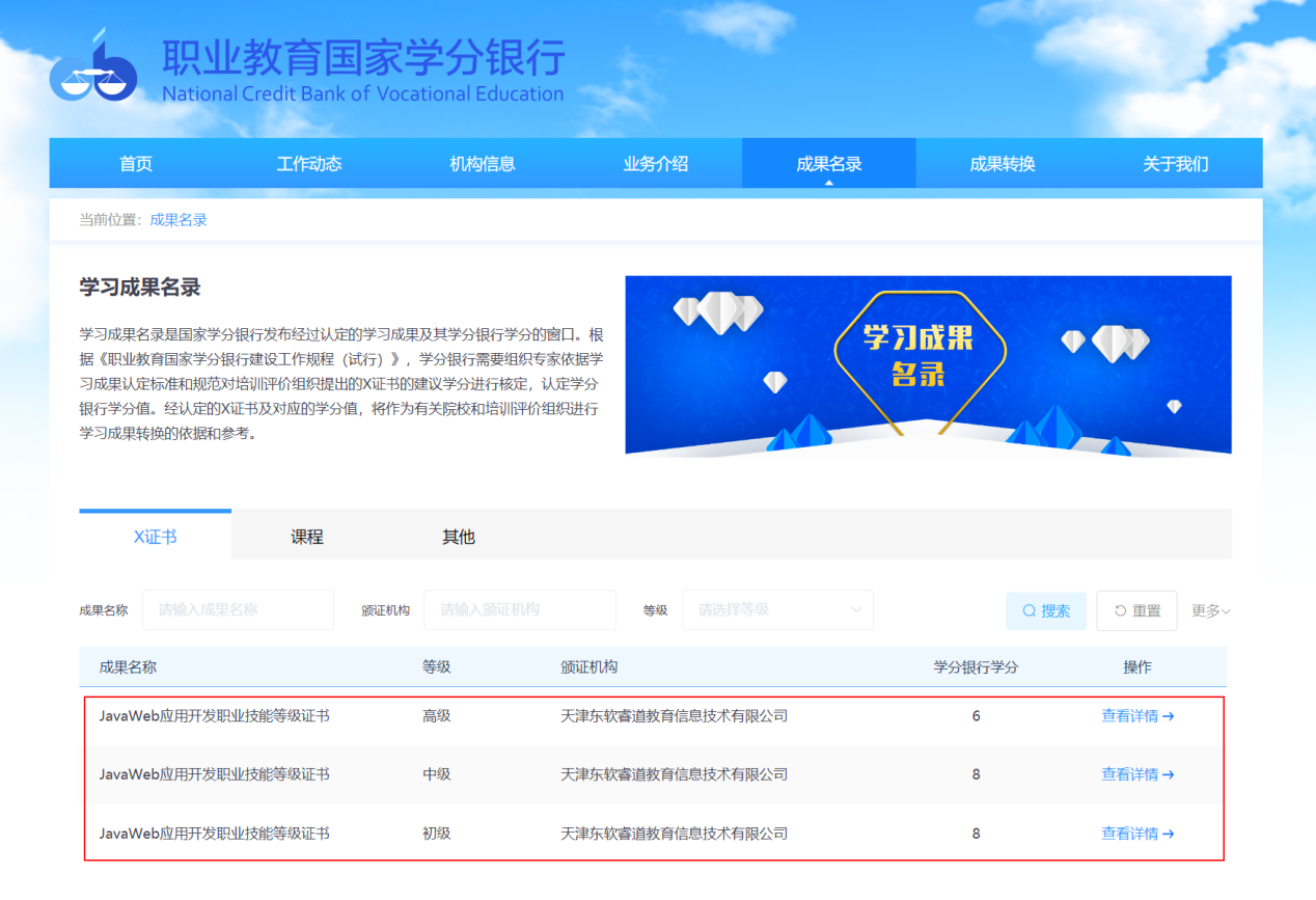 经职业教育国家学分银行综合审核,我司旗下天津球盟会(中国)睿道教育信息技术有限公司申请的JavaWeb应用开发职业技能等级证书符合国家职业教育学时学分认定的相关要求,已顺利获得认定,进入学习成果名录。凭借与生俱来的产教融合基因,顺利获得岗课赛证融通,球盟会(中国)教育基于TOPCARES方法学构建的JavaWeb认证证书,因其符合行业“五新”,充分对接岗位需求,具有行业应用面广、学生适应性强等特点,满足各层次软件人才的学习与考评,得到职业教育国家学分银行专家的高度认可而入选学习成果名录。