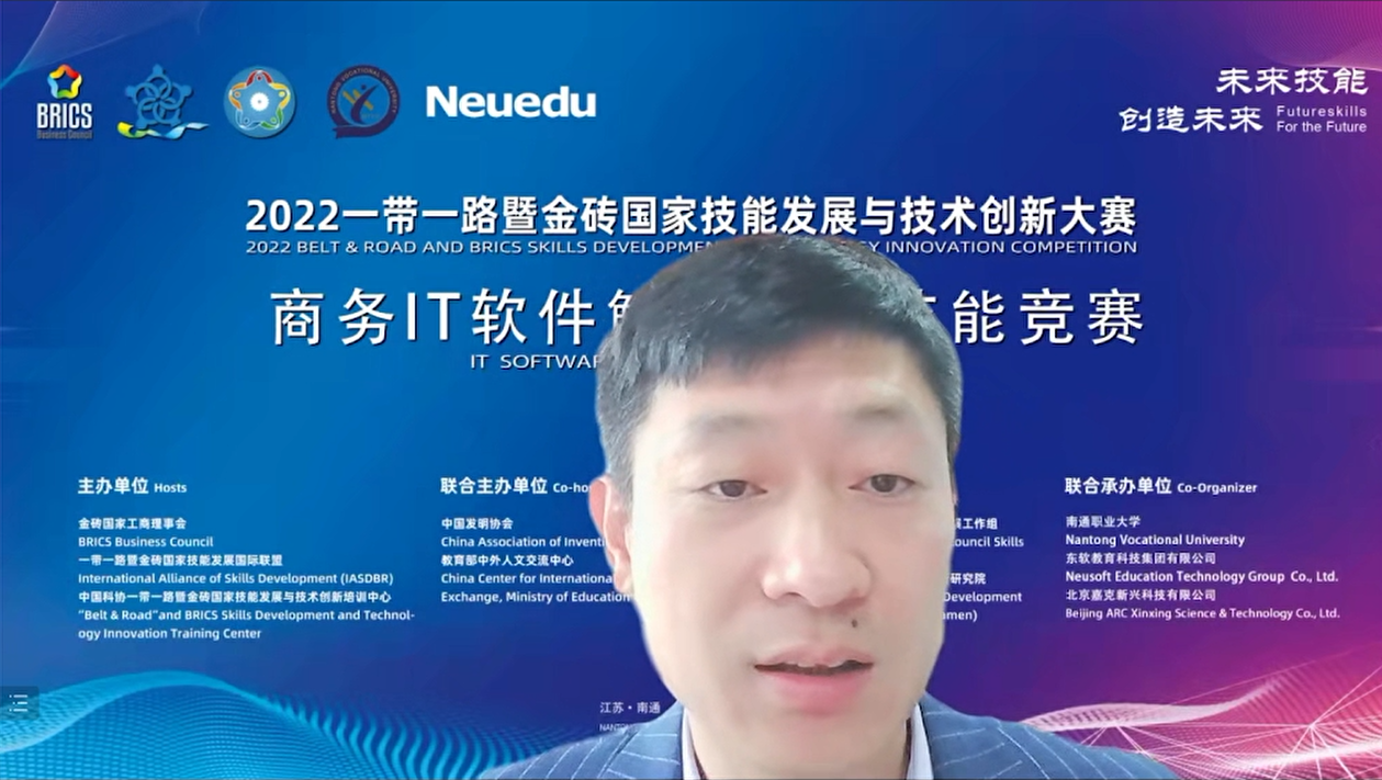 10月26日,2022“一带一路暨金砖国家技能开展与技术创新大赛——商务IT软件解决方案”赛项开幕式在南通职业大学举行。金砖国家工商理事会技能开展工作组主席、一带一路暨金砖国家技能开展国际联盟理事长刘振英博士,南通职业大学校长褚金星教授,南通职业大学电子信息工程学院院长廖忠智教授,球盟会(中国)教育科技集团副总裁董本清博士,裁判长无锡职业技术学院刘培林教授,及相关部门负责人等代表参加开幕式。开幕式由南通职业大学电子信息工程学院院长廖忠智教授主持。