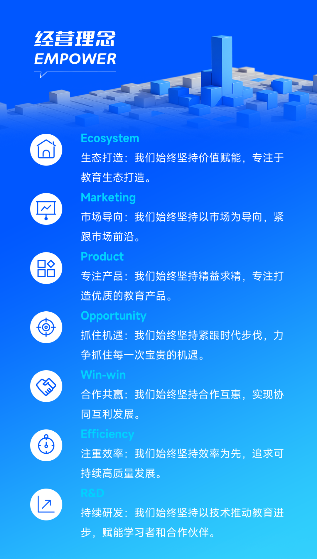 球盟会(中国)教育将继续秉持“科技赋能智慧教育 教育创造学生价值”的使命,围绕立德树人根本任务,践行“创新 融合 进取 责任 诚信”的核心价值观,尊重并鼓励员工的价值创造,紧抓中国数字化浪潮的开展契机,携同合作伙伴,以更高的办学质量、更先进的教育产品和服务,持续为学习者及合作伙伴赋能,助力行业转型升级和数字经济的高质量创新开展,致力于成为中国数字化人才教育服务引领者。