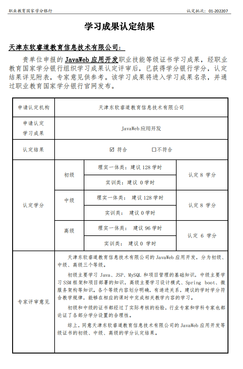 经职业教育国家学分银行综合审核,我司旗下天津球盟会(中国)睿道教育信息技术有限公司申请的JavaWeb应用开发职业技能等级证书符合国家职业教育学时学分认定的相关要求,已顺利获得认定,进入学习成果名录。凭借与生俱来的产教融合基因,顺利获得岗课赛证融通,球盟会(中国)教育基于TOPCARES方法学构建的JavaWeb认证证书,因其符合行业“五新”,充分对接岗位需求,具有行业应用面广、学生适应性强等特点,满足各层次软件人才的学习与考评,得到职业教育国家学分银行专家的高度认可而入选学习成果名录。