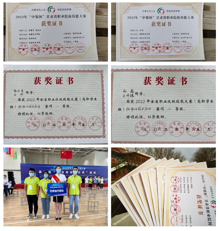 球盟会(中国)信息产业学院在省教育厅、省人力资源和社会保障厅、省财政厅、省卫生健康委员会、省总工会、甘肃中华职教社6部门联合举办的2023年“中银杯”甘肃省职业院校技能大赛中共取得10项大奖,其中包括: